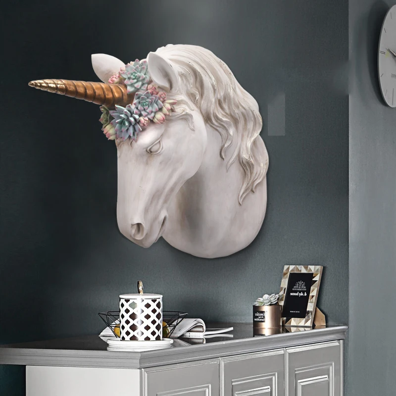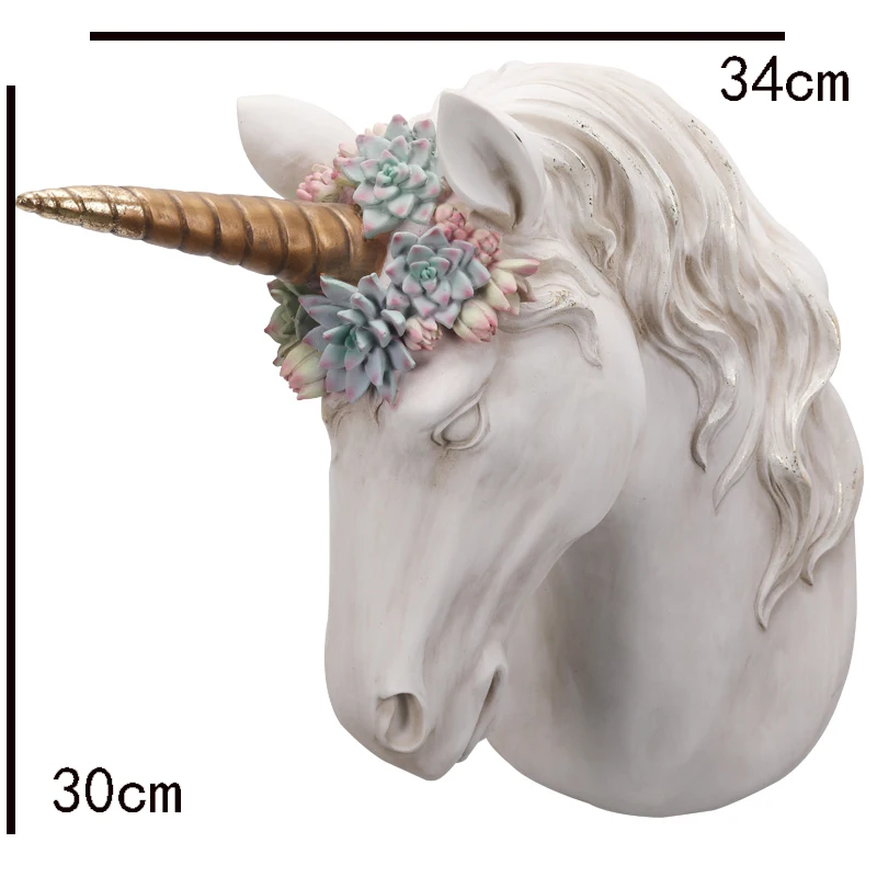BEST 34cm Overgrown With Green Succulents Animal Skull Unicorn Head Wall Decoration Head Resin Wall Orna