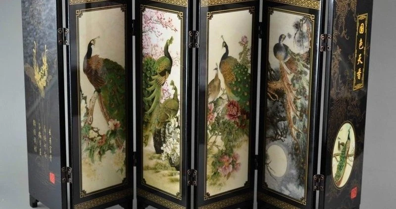 TOP 19" China Dynasty Palace Chinese Fine Lacquer Painted Peacock Screen Statue Wall